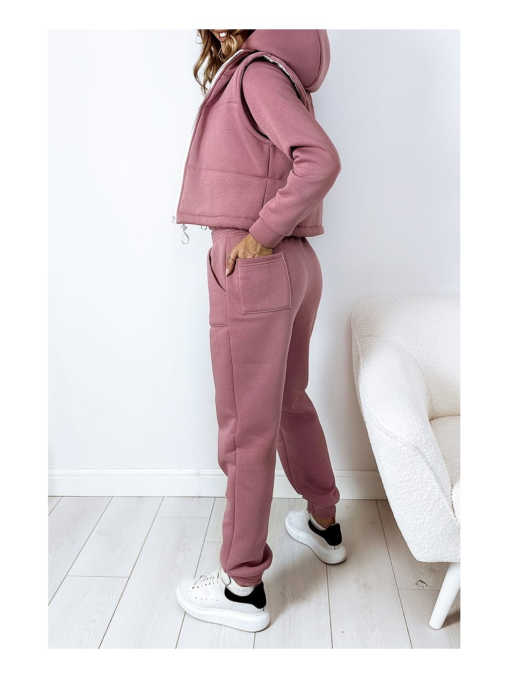 Sada obsahuje: dlouhé kalhoty s vysokým pasem, pohodlnou mikinu s kapucí a unikátní vestu. Mikina je ve spodní části zakončena elastickou, nesvazující gumou a kalhoty dokonale zdůrazňují postavu.