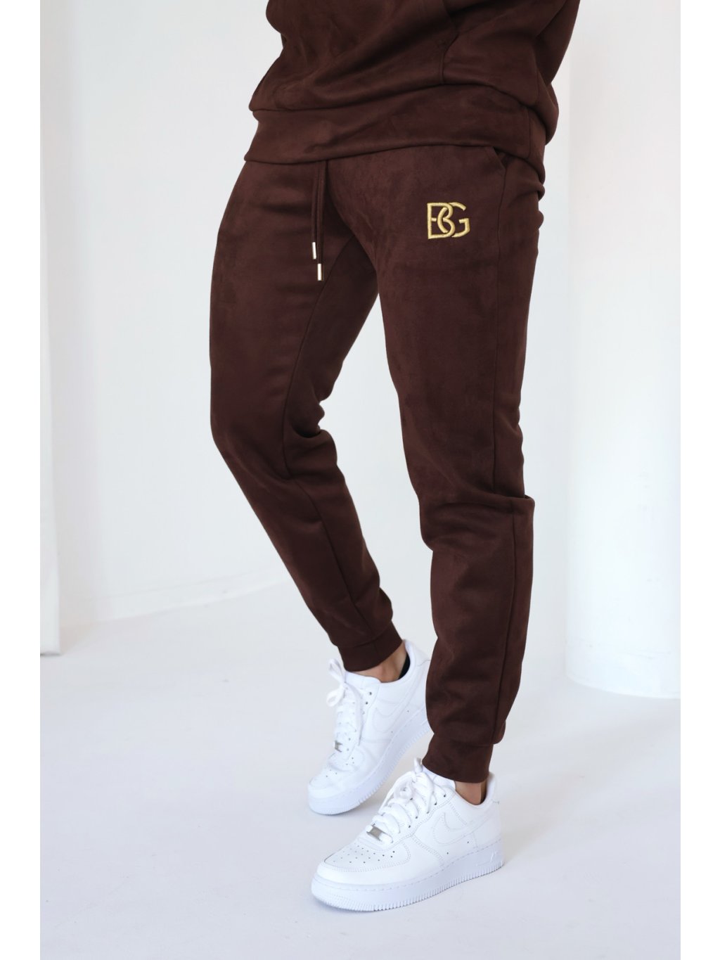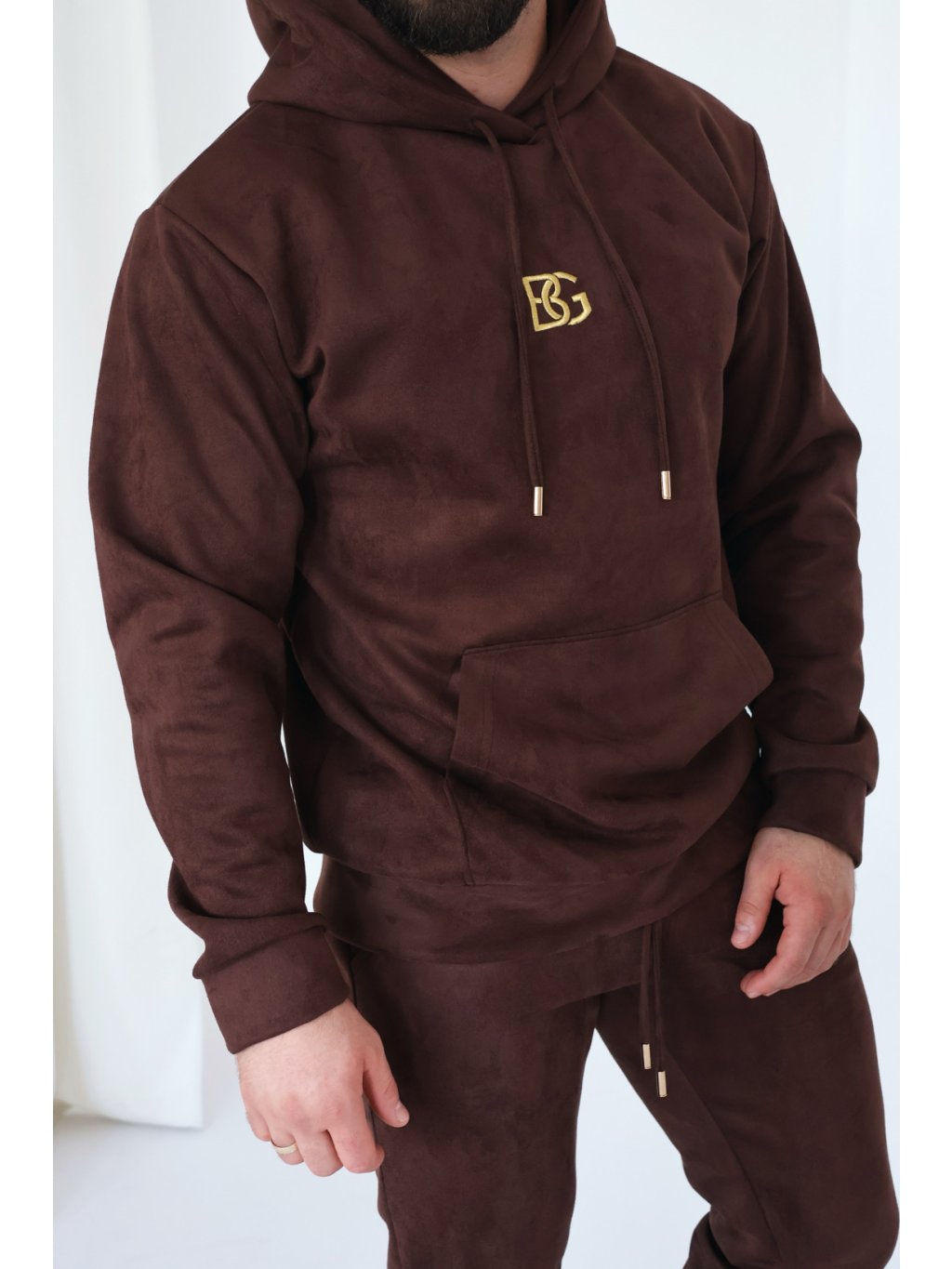 Semišová tepláková souprava BG OXY. Mikina a kalhoty se zlatou výšivkou BG, stahovací šňůrky na kapuci a v pase.